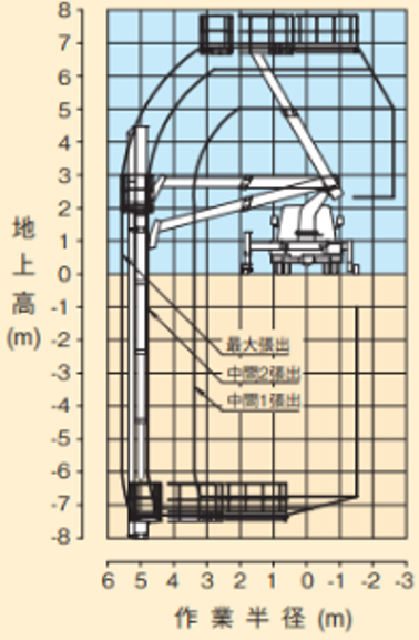 | 最大作業半径 | 5.6m(デッキ90°旋回時) |